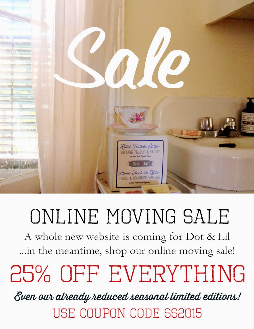 At checkout on www.dotandlil.com, enter code SS2015 in the coupon field, and your discount will be applied to your shopping cart. Make sure to check out the seasonal goods in our sale section for the best deals. Online moving sale end March 10th, 2015 at 9pm EST. As always, all orders over $50 ship FREE anywhere in Canada and the continental USA.