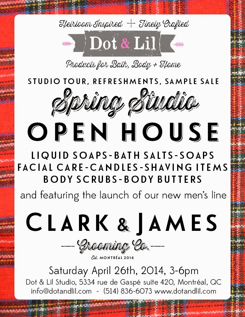 We have big things cooking at Dot & Lil this spring! New retailers, new collaborations, and the biggest news of all: a brand new men's line called Clark & James ready to launch on April 26th at our annual spring studio Open House! You may have noticed by now that there is nothing we love more than throwing parties and having people who love Dot & Lil in our little studio. And this event will be no exception. We are planning our best event ever! The new men's line will be featured, with the products available for sampling and sale along with our classic Dot & Lil items. Pick up Mother's Day and Father's Day gifts, a treat to congratulate yourself for making it through the endless winter, or stock up with heavily discounted items from our special sample sale section.
