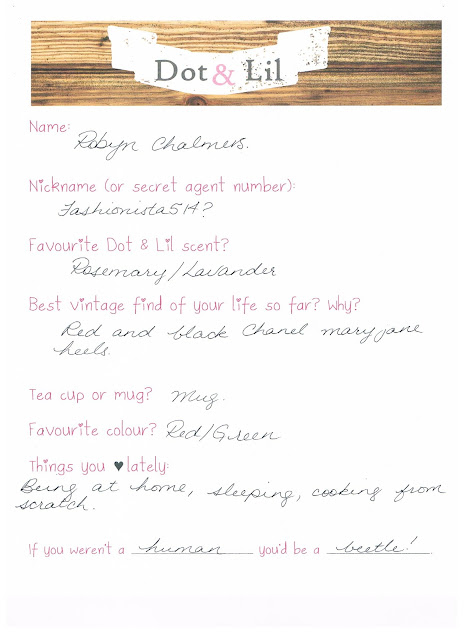 The treat in yesterday's day at Dot & Lil was a studio visit from Fashionista 514, a.k.a. Robyn Chalmers. Here's what Robyn had to say about herself after being plied with tea & cookies while browsing around and learning about our product line.