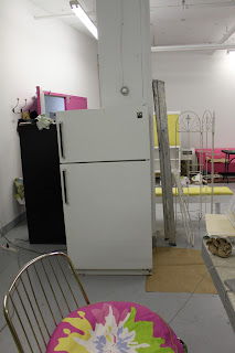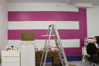 My first crazy-crazy idea was to paint the showroom wall in big pink stripes. And our ceilings aren't exactly low, so a big job!