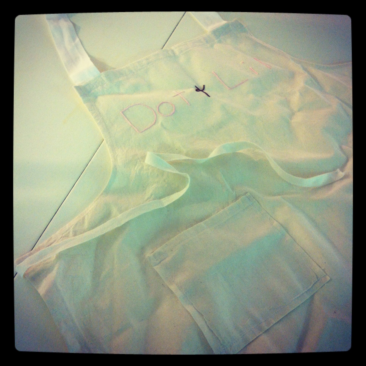 At our open house on May 12th, we'll be doing several door-prize draws. Here are pictures of some aprons that will be included in the giveaways! Handmade cotton aprons that have been hand-embroidered with 'Dot & Lil'.