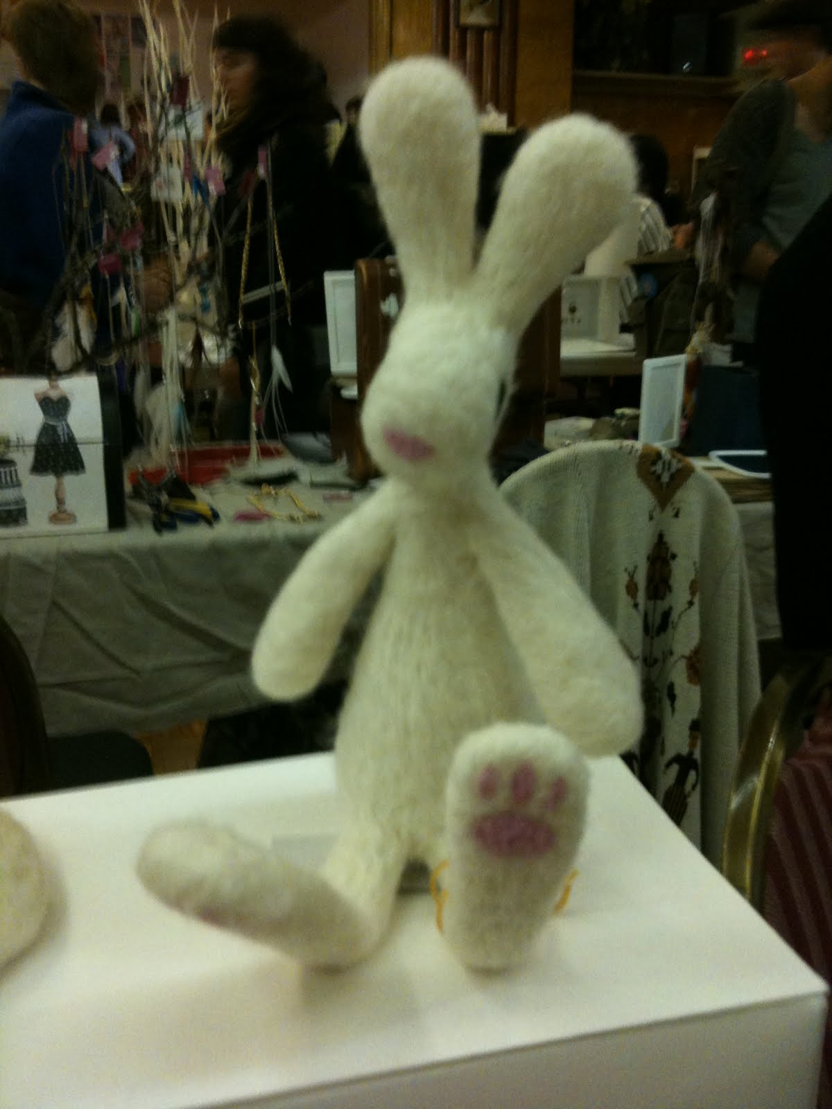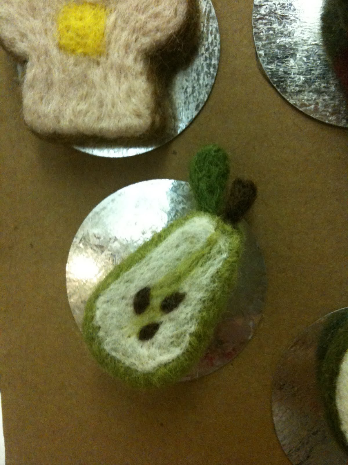 Right across from me all weekend in convenient staring position for me were the creations of Squid Wool with felted animals and food that really grab your attention. My mom scored fantastic felted carrot and felted pepper brooches that she has been wearing ever since. My personal favorites are the pear, which is just too perfect, and the little mice, both pictured below, . All the items are needle felted by hand in Montreal. You guys know I'm a sucker for local handcrafted things with good design! You can follow @SquidWool on Twitter, check out the etsy shop or learn about it on the Squid Wool blog. I especially like this post which features pictures of Squid Wool felted animals in nature--amazing!