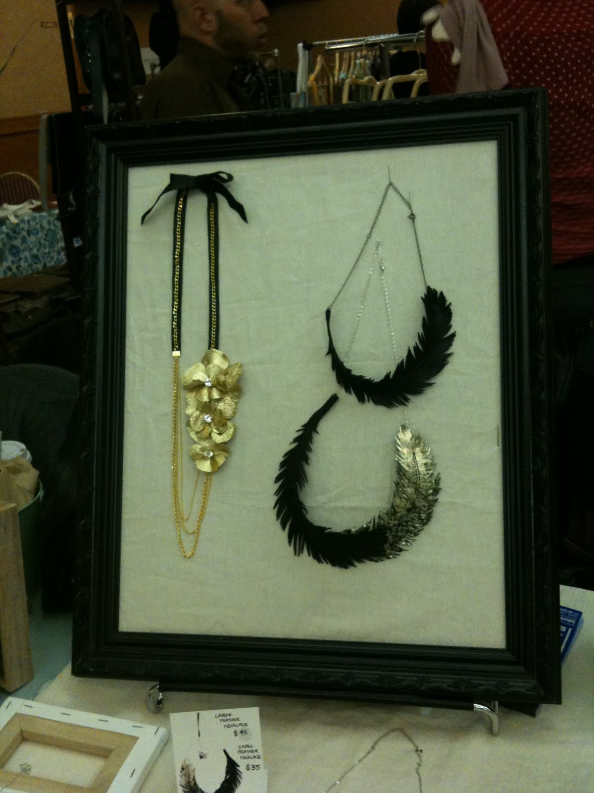 Then, in the row right behind me was Love At First Blush with leather cuffs and jewelery, perfect display and a great design sensibility that is clean, crisp and lovely! The leather feather and the flower necklaces, both below, are my favorites but I just in general love the way everything is presented! You can check out the Love At First Blush etsy shop, follow them on Twitter as @LoveAtFrstBlush or learn more about the beautiful things Sabrina, Love At First Blush's designer, makes on their blog.
